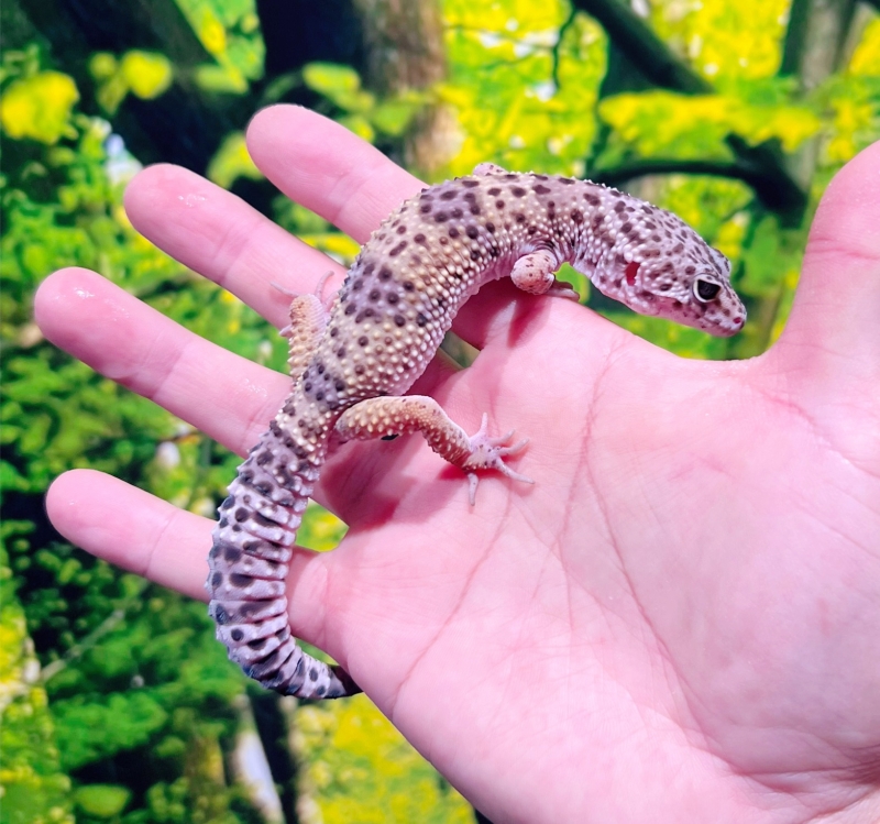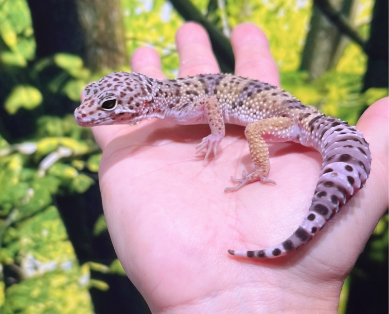 生体について: ヒョウモントカゲモドキ4原種の内の基亜種マキュラリウスです✨イエローベースにパープル色を載せた見た目がおしゃれ映え✨全身に散りばめられた斑点がレオパ〜って感じに惹き込まれて最高の1匹👍